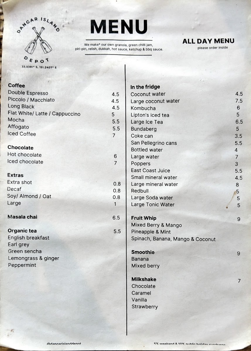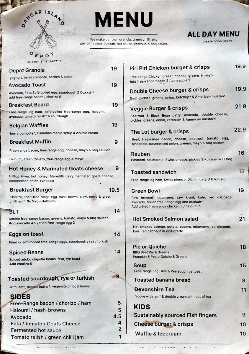 Dangar Island Depot offers a charming blend of rustic café fare and general store essentials, nestled on Dangar Island in NSW. The menu highlights thoughtfully prepared breakfast and lunch options like the famed avocado toast—with bacon, a standout among reviewers—and the hearty Rueben sandwich praised for its rich, river-inspired flavors. Guests can also indulge in a well-crafted affogato, combining robust coffee with velvety vanilla ice cream, or savor the satisfying beef burger accompanied by flavorful chips in two varieties.